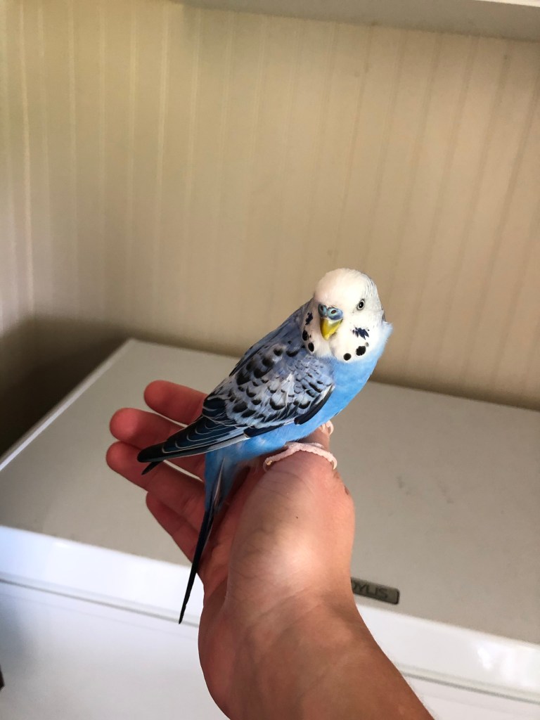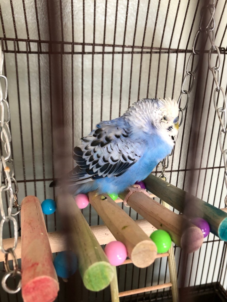 I obtained him through a coworker who said in passing, “My friend Alisha is looking to rehome her parakeet. She’s asking on Facebook if anyone’s interested. She says he’s a happy boy but he sings too much through her kids’ naptime.”